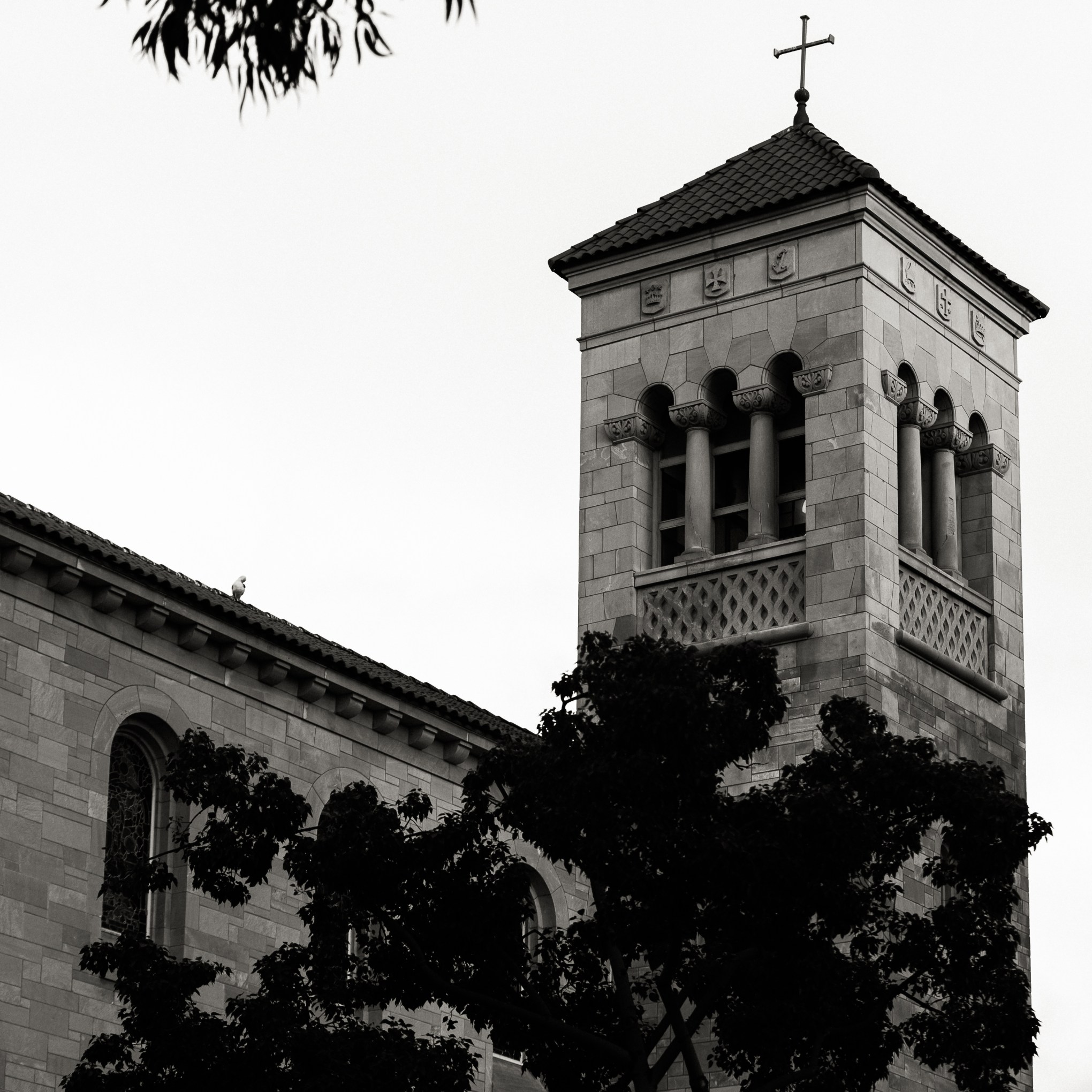 The El Nino storm came through today and as of 4PM PT, Santa Monica airport received .97″ during the previous 6 hours. With the clouds breaking up around sunset – the sky was on fire – again. However, I was intrigued with St. Monica’s Church against the sky and the hues against its sides. I decided to shoot in black and white for the dramatic effect.
