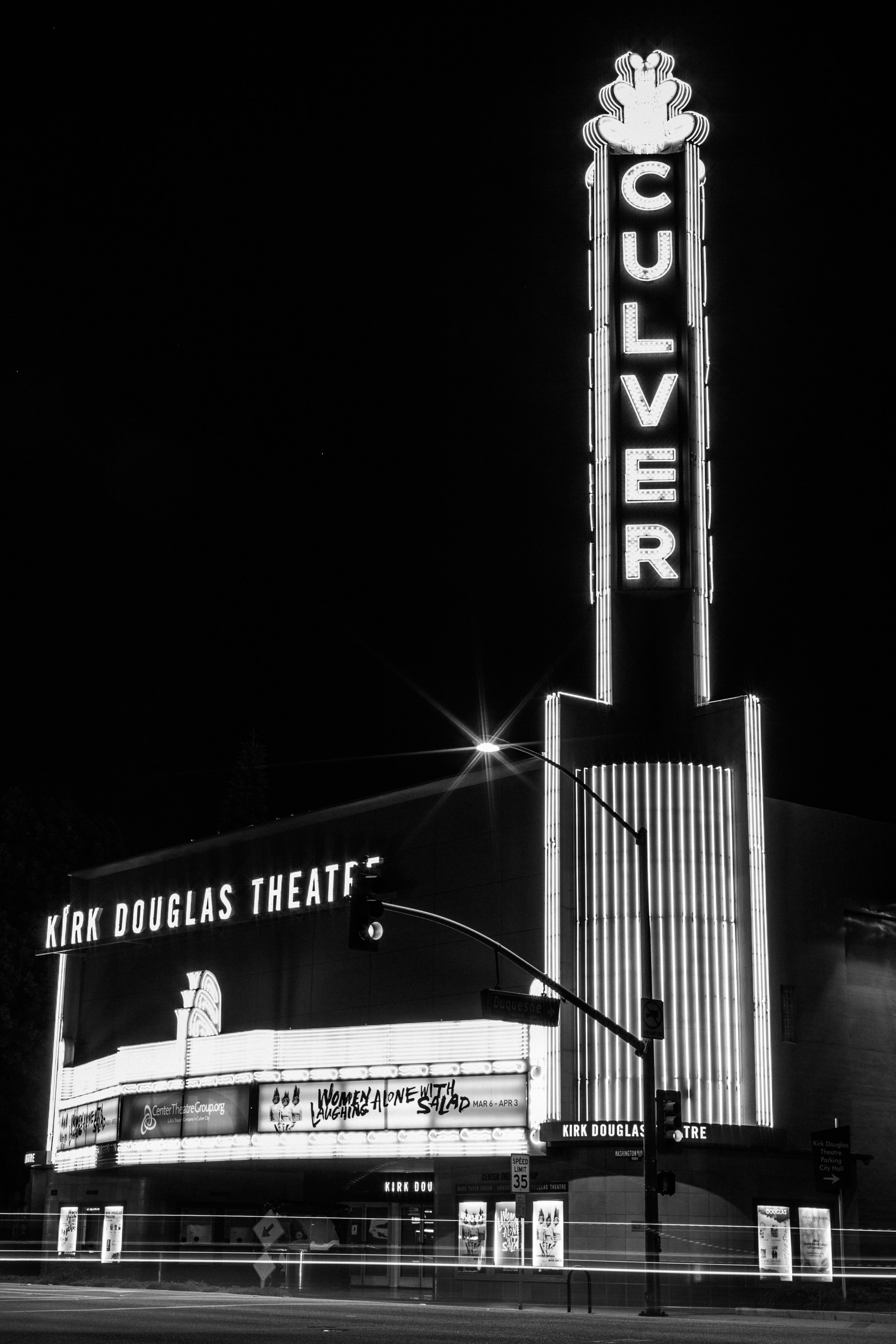 Every other Sunday I take my older kids to their high school youth group in Culver City and always pass by this theatre. I just noticed tonight that you can actually see this off the 10 freeway. Anyway, I’ve always been attracted to neon signs and this marquee has captivated me for quite sometime, so tonight, I decided to shoot it. I think a wide angle would have been a better selection in order to get closer, but I didn’t want to contend with distortion, etc. So I used my trusty 50mm f/1.2L, f/14, ISO 100 to extract the star burst from the street lights (not quite as prominent in this shot – but are clearly visible in other images that ‘didn’t make the cut tonight). As I approached the street corner – I had the bonus of capturing a man sleeping on the bus bench on the corner.