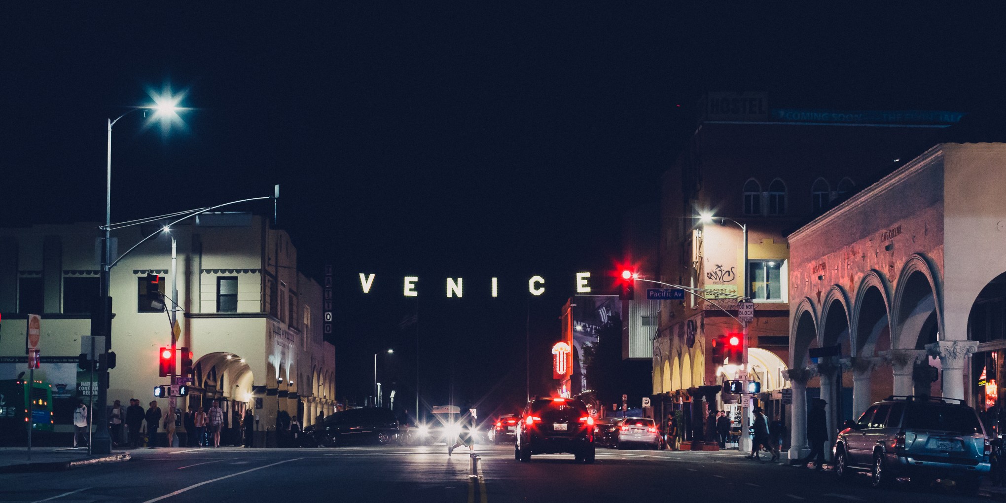 Venice Beach is one interesting place, especially at night. The “nomads, hobos, vagabonds, urban campers, bohemians, hippies, housefree, houseless, van dwellers, travelers, etc.,” as expressed by @StandAloneHobo, the tourists, the teenage runaways, the locals, and the yuppies hitting the local restaurants. I love the artwork/graffiti throughout the city. The “Venice” sign illuminates the little main street that leads into the Venice Beach strand that is replete with Muscle Beach, shops, restaurants, drum circles, skate park, graffiti park, and the medical community has expanded quite a bit. With all of the ‘green’ doctors here, you would think Glaucoma would be eradicated by now! 🙂 Anyway, Venice is to my south, has a unique vibe unto itself, and I’ve always enjoyed the architecture of this little section.