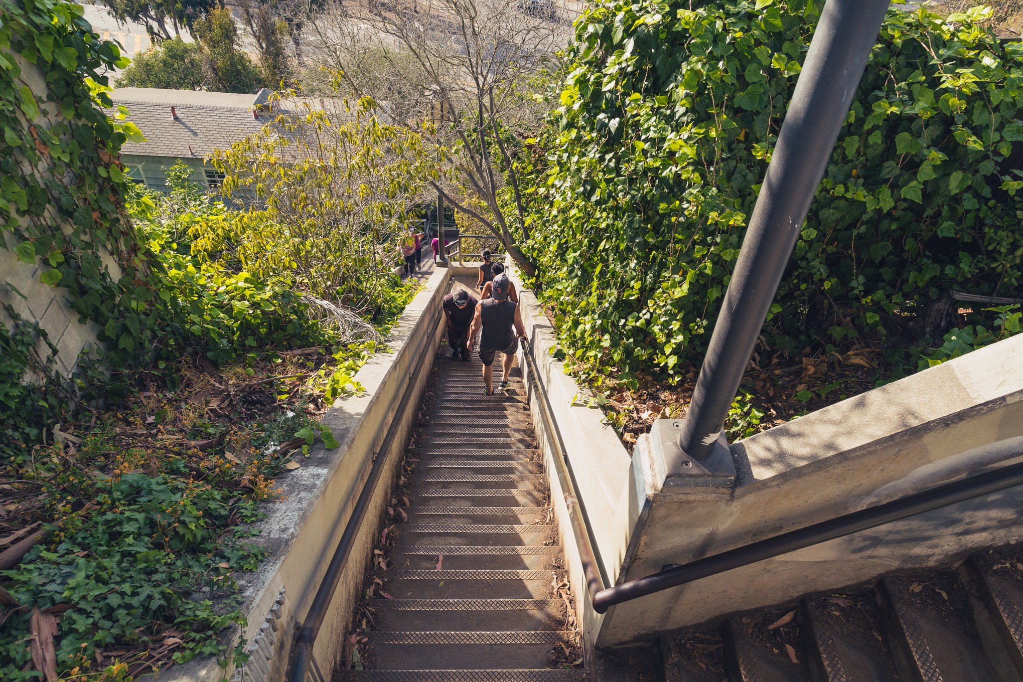 It was hard to capture this image in a way that truly represents these stairs. You can see the road down below. This is a very popular place for the local residents to work out – you can find people running up/down the stairs, or making it a loop with another set of stairs. Chalk lines mark the sidewalk and railings as people count their reps. I put my two year on my shoulders and descended, snapped a couple images, then began a rapid ascension. It soon became apparent “I ain’t no youngin’ anymore” and am out of shape. Of course I had an extra 20-30#, but none-the-less, around stair 40 I started feeling it! The count? 189 stairs in all.