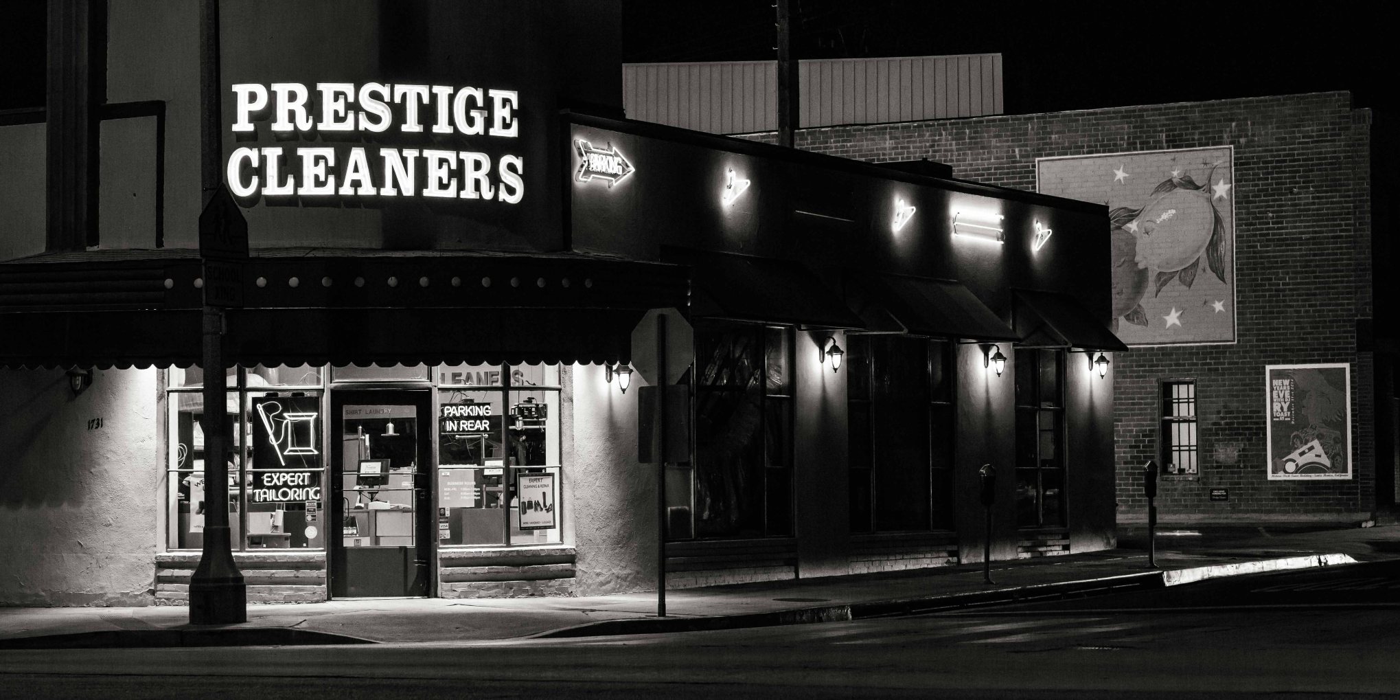 Is it too late to drop off my dry cleaning? 🙂 I like this building, as I’ve mentioned before, I’m a big fan of neon and this place has a lot of it! The building is yellow with green awnings and a brick building behind with some interesting murals painted on the backside. Great cleaners, great tailors, and a great building!