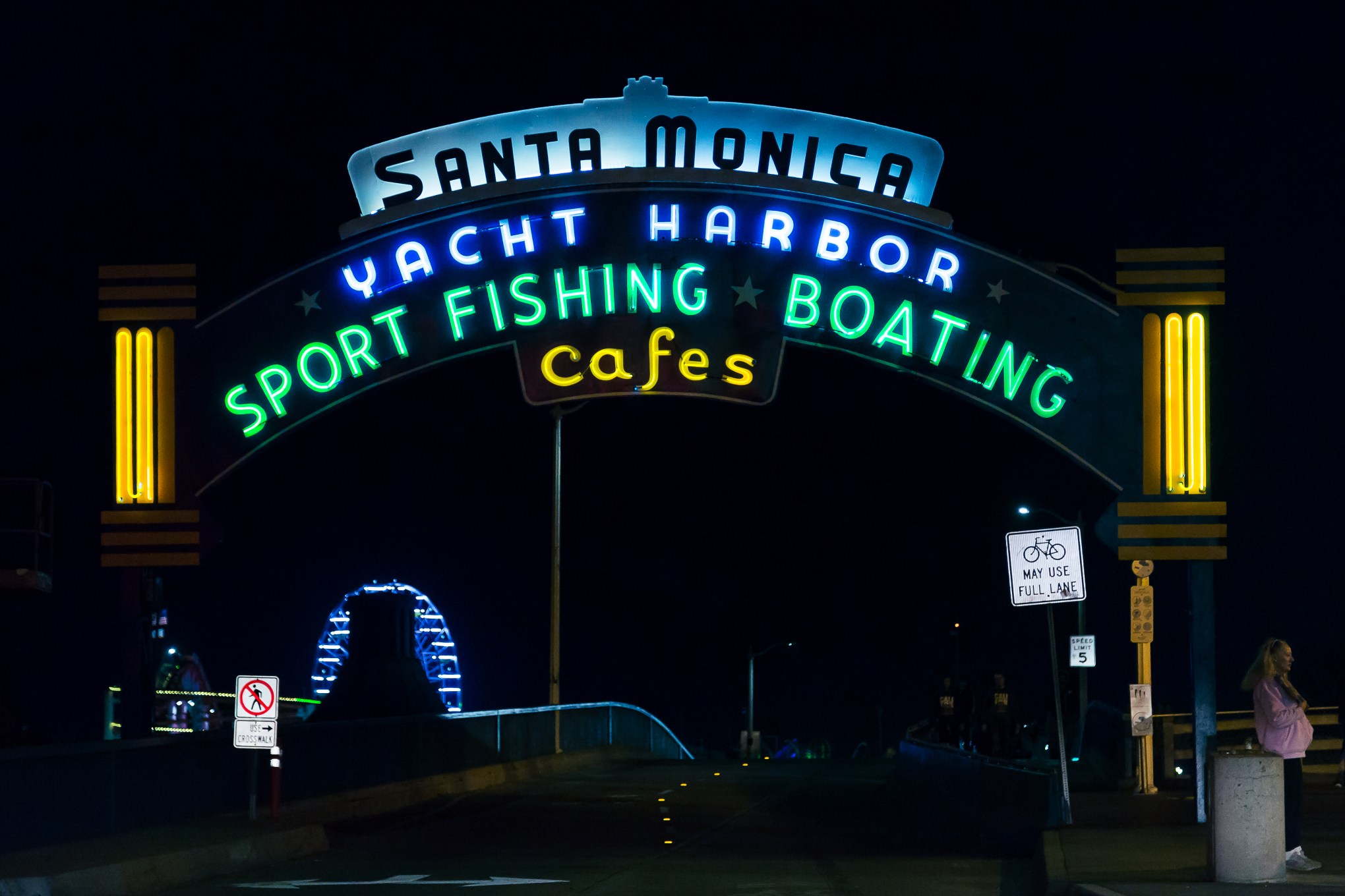 I picked up my older son from his high school performance practice and headed down to the pier. Now that Colorado Blvd. is open with the opening of the train, it’s easier to get a straight on shot. However, I was in my car with a brief red light, so I quickly cranked my ISO to 3200 and set the shutter to 1/200″ so I could handhold while hanging out the window. Tonight was more of a practice of quickly getting the manual settings where I need them to get the light, “freeze” movement, and handhold without being able to ‘tripod’ my camera securely. Oh, and to complete the triangle, f/4.0.